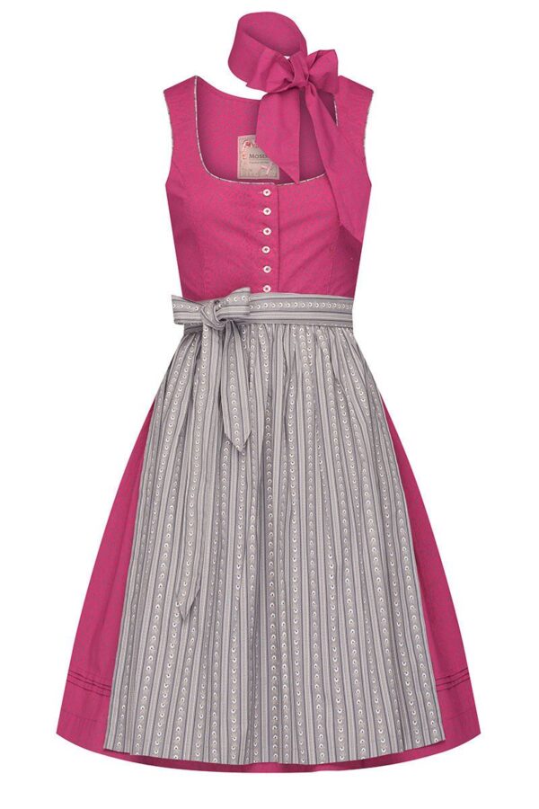 MOSER Mini Dirndl 60 cm beere grau inkl. Schal Clara Mini Dirndl in knalligem Beere-Ton mit floralem Musteraus 100 % Baumwolleabgerundeter Ausschnitt mit grau gemusterter Paspelinkl. farblich passendem Schal als trendiges Accessoire zum Dirndlgraue Schürze mit hübschem Retro-Muster in Weiß, Schwarz und Taupevon führenden Dirndl-Herstellern für MOSER gefertigt