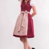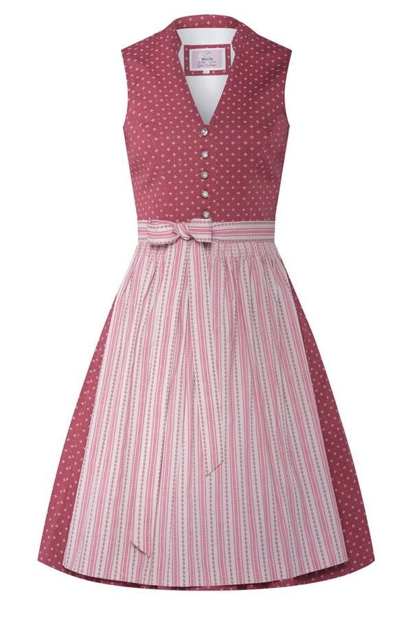 MarJo Mini Dirndl 60 cm rosenholz altrosa gemustert Valentina hochgeschlossenes Baumwolldirndl im Vintage-LookDirndl aus der MarJo "Grace Collection"silber glänzende Knöpfe mit Glitzersteingestreifte Schürze in Altrosa mit filigranen Rankenbortenklassisch mit Schleife zu binden